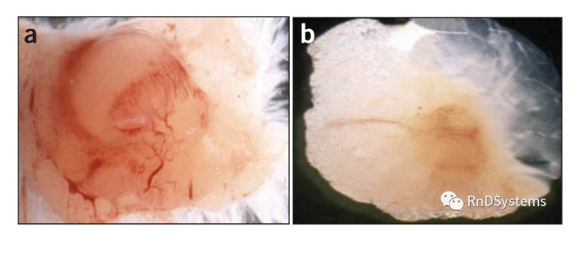 在SCID小鼠乳房內(nèi)脂肪墊中接種106MDA-MB-468后9天的腫瘤生長對(duì)比。(a)為混合了低生長因子無酚紅的基質(zhì)膠的實(shí)驗(yàn)組,(b)為不加基質(zhì)膠的對(duì)照組?;|(zhì)膠的存在不但加快了腫瘤生長,也促進(jìn)了血管形成。