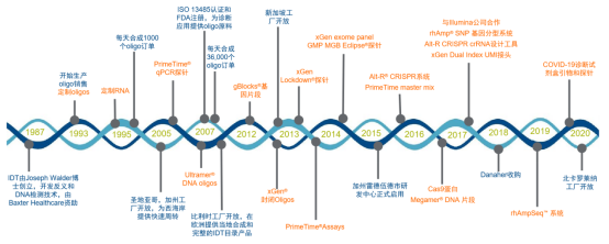 美國(guó)IDT公司,總部位于美國(guó)愛(ài)荷華州科勒爾維爾,成立于 1987年,是基因組學(xué)領(lǐng)域開(kāi)發(fā)的領(lǐng)先者,也是公認(rèn)的定制核酸生產(chǎn)行業(yè)的領(lǐng)導(dǎo)者。下圖是IDT從成立至今的重大事件圖鑒(藍(lán)色是資本并購(gòu),橙色是技術(shù)產(chǎn)品革新)。