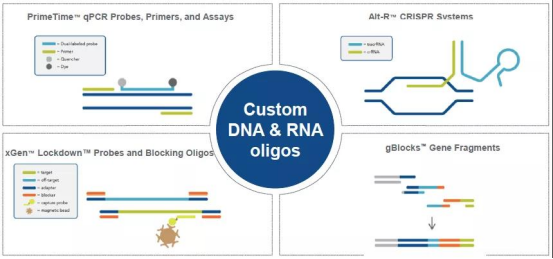 歷經(jīng)三十年的開(kāi)疆拓土,各種資本與技術(shù)并購(gòu),IDT以Oligos(寡核苷酸)的合成作為核心技術(shù),為基因組學(xué)應(yīng)用開(kāi)發(fā)了專有技術(shù),主要分為四大塊,下一代測(cè)序NGS、PCR引物探針、CRISPR 基因組編輯所用到的功能蛋白,模板DNA,向?qū)?span>RNA等、基因片段的合成。通過(guò) GMP 服務(wù),IDT的產(chǎn)品被科學(xué)家用于研究多種癌癥以及大多數(shù)遺傳性和傳染性疾病。
