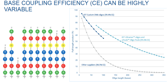 IDT的合成Oligo憑借其高質(zhì)量標(biāo)準(zhǔn)受到全世界科研者的青睞。IDT 采用合成柱法的方式單獨(dú)合成每條Oligo,在每個(gè)堿基耦合的過(guò)程中涉及到一個(gè)“偶聯(lián)效率”的概念,造就了超高的合成精度。同時(shí)IDT合成的高質(zhì)量不是說(shuō)出來(lái)的,嚴(yán)謹(jǐn)?shù)馁|(zhì)控更是將產(chǎn)品質(zhì)量拿捏的死死的,每條Oligo通過(guò)ESI-MS(電噴霧質(zhì)譜)質(zhì)譜的方式,讓錯(cuò)誤的Oligo無(wú)所遁形,并且每一個(gè)通過(guò)質(zhì)檢的oligo都有一個(gè)質(zhì)控報(bào)告,也為后期IVD客戶做申報(bào)工作提供了極大的便利。