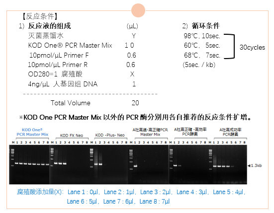 東洋紡產(chǎn)品KOD OneTM PCR Master Mix/ KOD OneTM PCR Master Mix -Blue-(Code:KMM-101/KMM-201)因其對土壤腐殖酸的高度耐受而廣受好評。并且在含有腐殖酸的人類基因組模板下,都可以輕松實現(xiàn)HBg基因的擴(kuò)增。