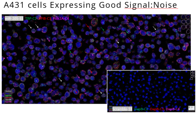 得益于ACD專利的探針設(shè)計及信號放大技術(shù),小RNA分子及mRNA分子的信號最終都可獲得高信噪比。下圖展示在細(xì)胞片中對miR-205和3個mRNA的陽性對照探針及陰性對照探針的檢測。陽性對照中各個通道上的信號點清晰,陰性對照中全片非常干凈,體現(xiàn)出方法的高特異性。