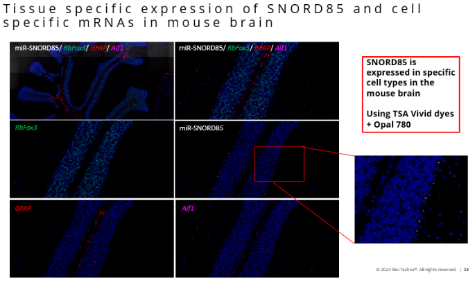 在小鼠腦組織切片的檢測中,也可獲得理想的結(jié)果。SNORD85可在小鼠腦某些細(xì)胞中特異性表達(dá),下圖中除了對SNORD85進(jìn)行檢測外,也對小鼠的神經(jīng)元(Rbfox3)、星形膠質(zhì)細(xì)胞(GFAP)、小膠質(zhì)細(xì)胞(Aif1)同時進(jìn)行檢測,可見不同靶標(biāo)特異的定位特征。