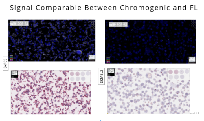 針對同一個miR-205分子,對比使用RNAscope Plus的熒光信號與使用可見光試劑盒miRNAscope的可見光紅染信號,二者對于miR-205不同表達(dá)豐度的細(xì)胞中小RNA分子的檢出結(jié)果有較高的一致性,證明不同的顯色方式對于靶標(biāo)的檢測沒有影響。