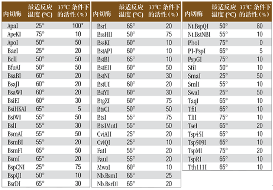 表中列出了限制性內(nèi)切酶的最適反應溫度。對于最適反應溫度不是 37℃ 的限制性內(nèi)切酶,請閱 2013﹒2014 商品目錄 284 頁查詢其在 37℃ 時的活性。