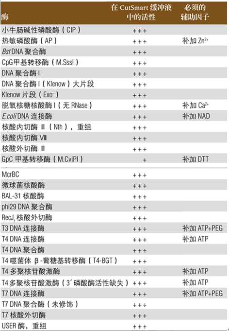 在常用的克隆酶中,選出了一系列 DNA 修飾酶,用 CutSmart 緩沖液代替隨酶提供的緩沖液,進行酶活檢測。比較酶在 CutSmart 緩沖液(添加必須的輔助因子)和隨酶提供的緩沖液中的活性。反應體系是根據(jù)修飾酶的推薦反應體系建立的,用 CutSmart 反應緩沖液替代隨酶提供的反應緩沖液。結果比較如下表中所示。