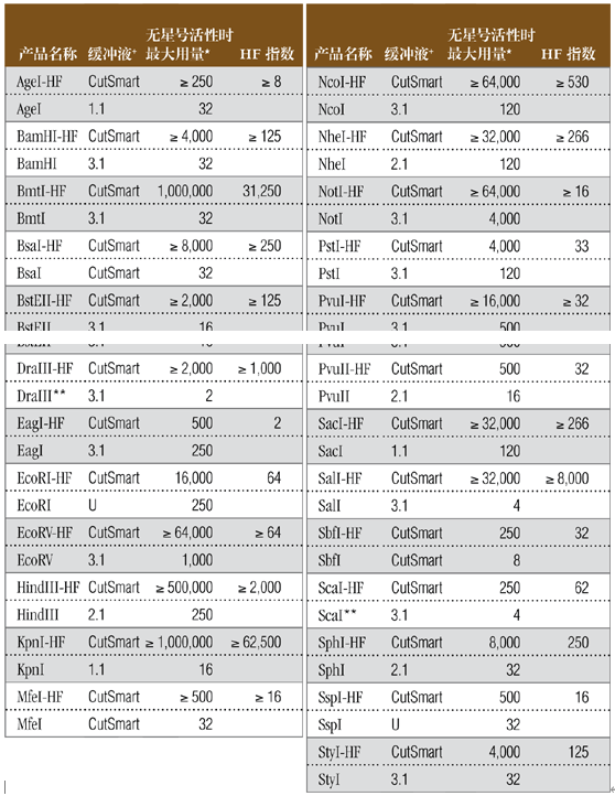 下表為 HF 內(nèi)切酶和其野生型在檢測到明顯星號活性前的最大酶用量。HF 指數(shù)代表在選擇 HF 內(nèi)切酶時酶用量增加的倍數(shù),數(shù)據(jù)清楚顯示了 HF 內(nèi)切酶帶來的靈活性。
