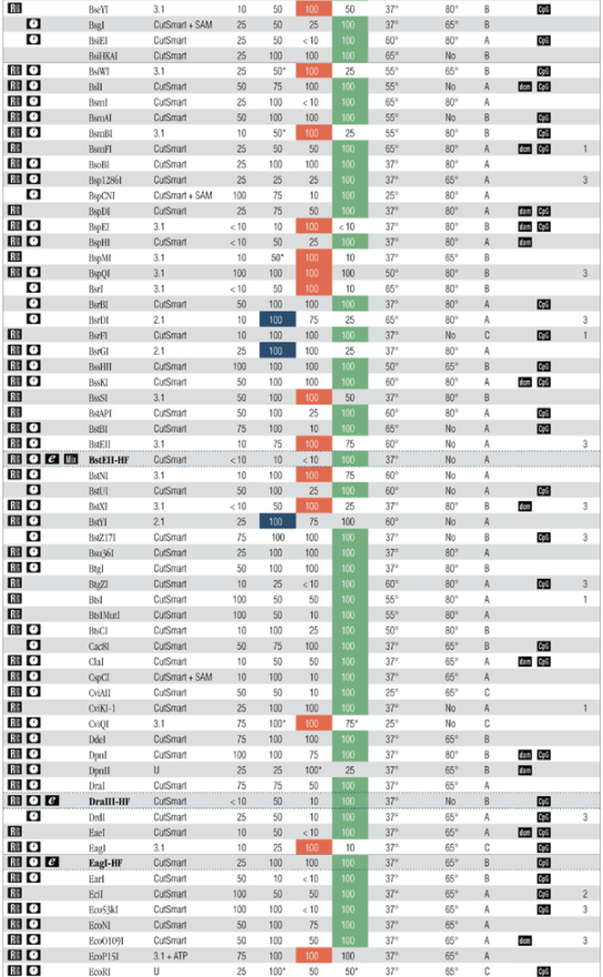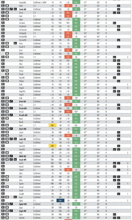 該表總結了 NEB 所有限制性內(nèi)切酶的活性信息。為了幫助您選擇雙酶切的最佳條件,該表列出了酶的最佳活性 NEBuffer(隨酶提供)和每種內(nèi)切酶在四個標準緩沖液中的活性。需要注意的是 BSA 現(xiàn)在已經(jīng)添加到緩沖液中,不再單獨提供。雙酶切反應體系請參考 2013﹒2014 商品目錄第 276 頁。此外,活性表中列出了反應溫度、熱失活溫度、推薦稀釋液、甲基化敏感性和該酶是否有省時酶特性(即在建議的反應條件下,5-15 分鐘可完全切割底物,過夜酶切也不會降解 DNA)。