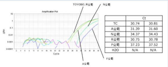 右圖,比較了檢測腸病毒RNA時Ct值。使用TOYOBO的UNG條件時檢測靈敏度沒有問題,使用其他公司的產(chǎn)品時Ct值出現(xiàn)了延遲。