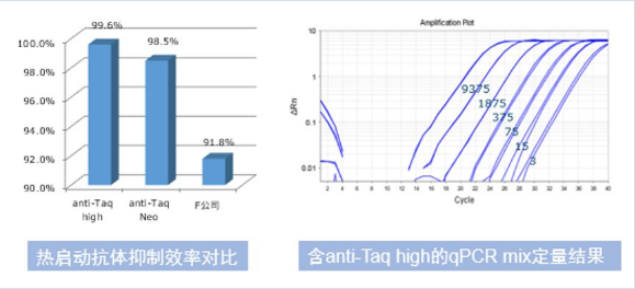 anti-Taq high是針對Taq DNA聚合酶的單克隆中和抗體,使用抗體熱啟動法可以有效抑制非特異性擴增,增強PCR的特異性和靈敏度。在進入PCR循環(huán)前的預(yù)變性階段,Taq酶的活性即被完全激活,使用起來方便快速。此外,可提供用于凍干的無甘油版本。